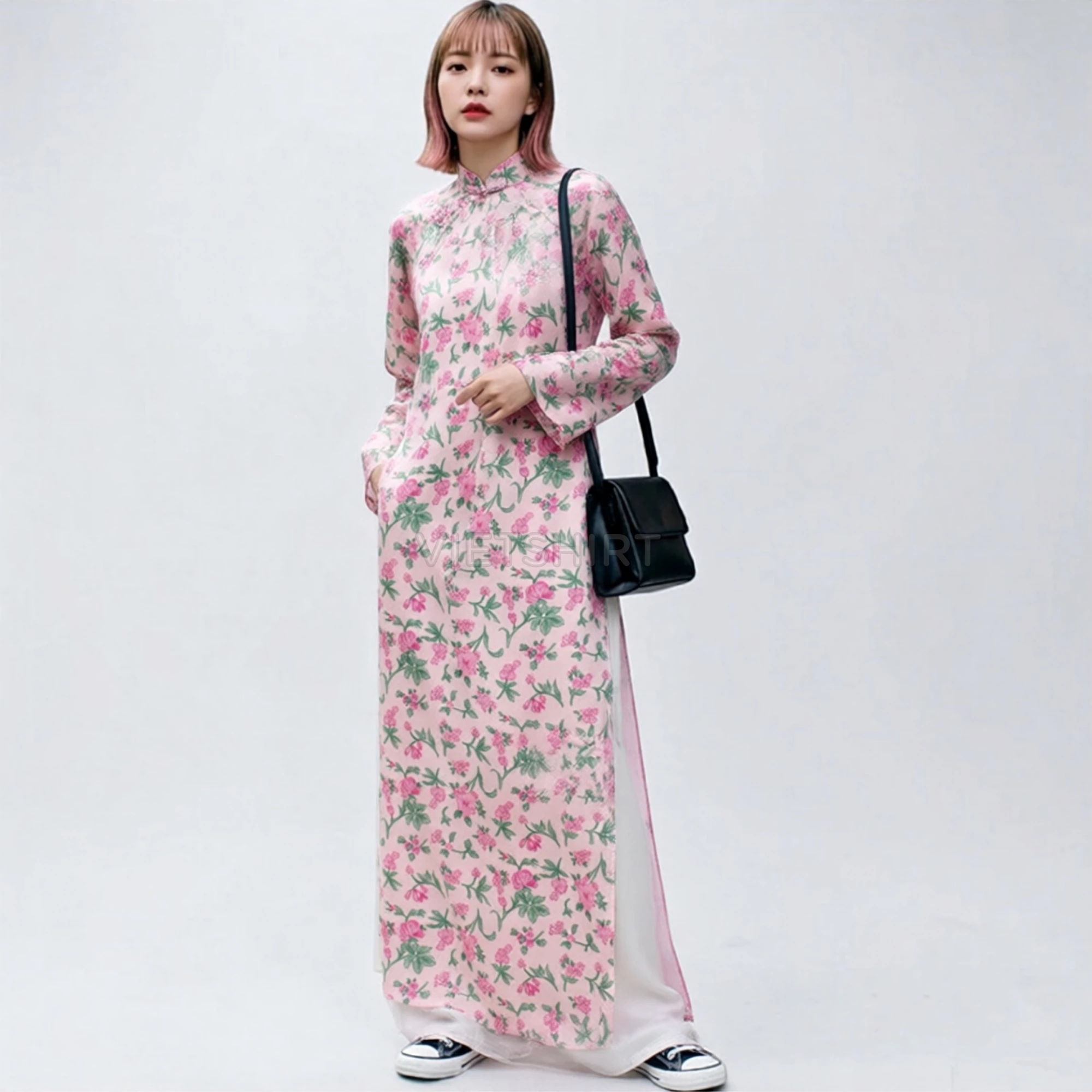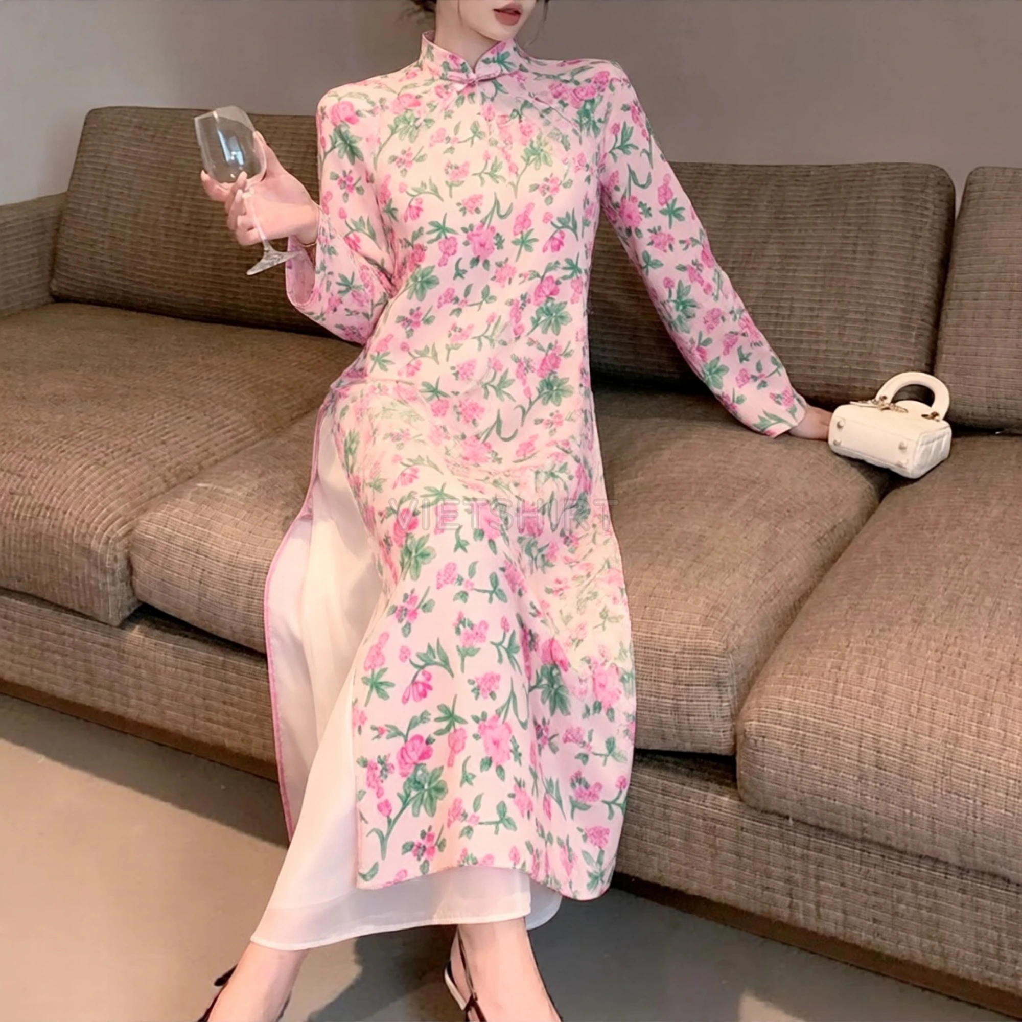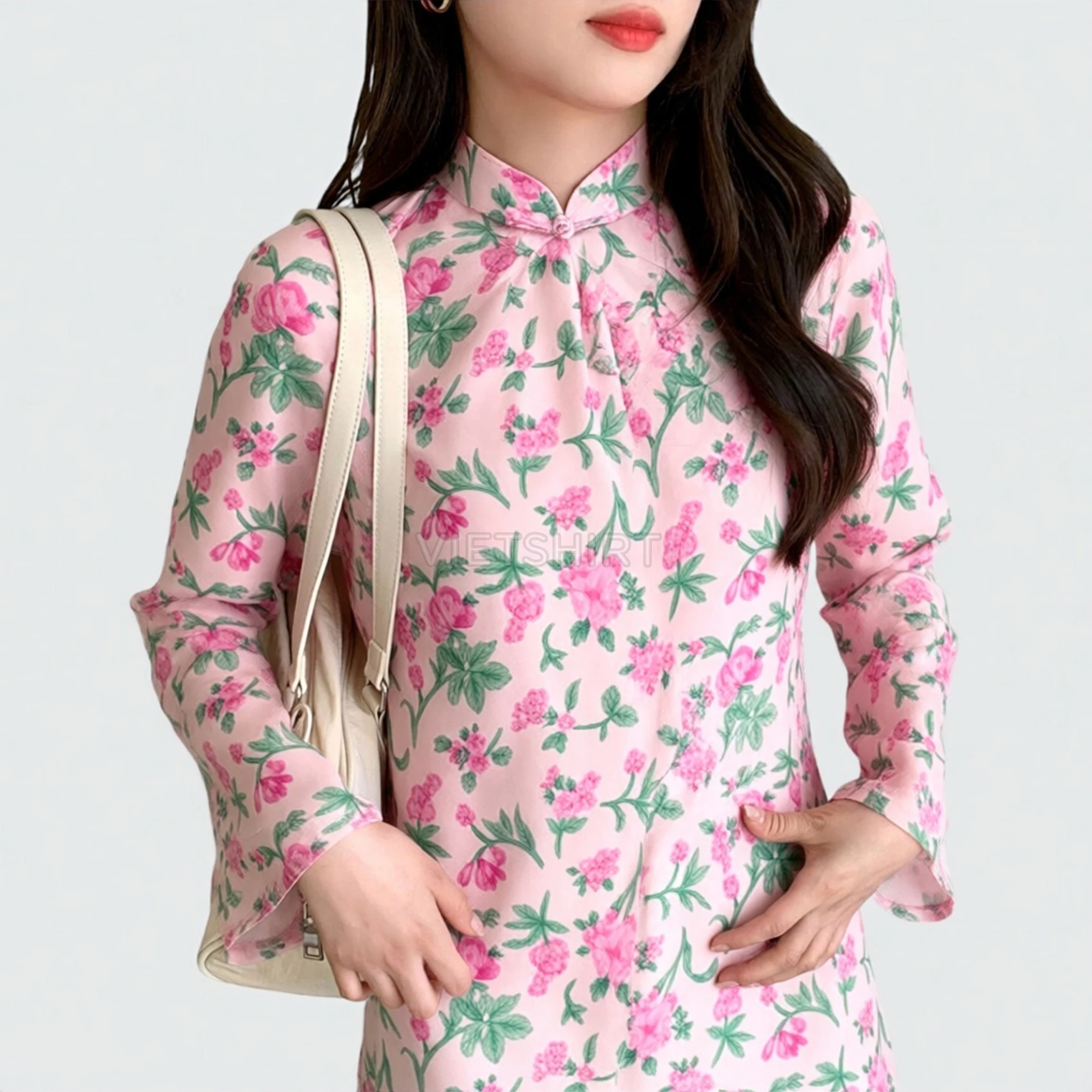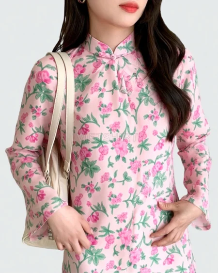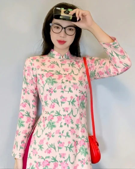 Vải may thô cotton baby thêu hoa màu hồng