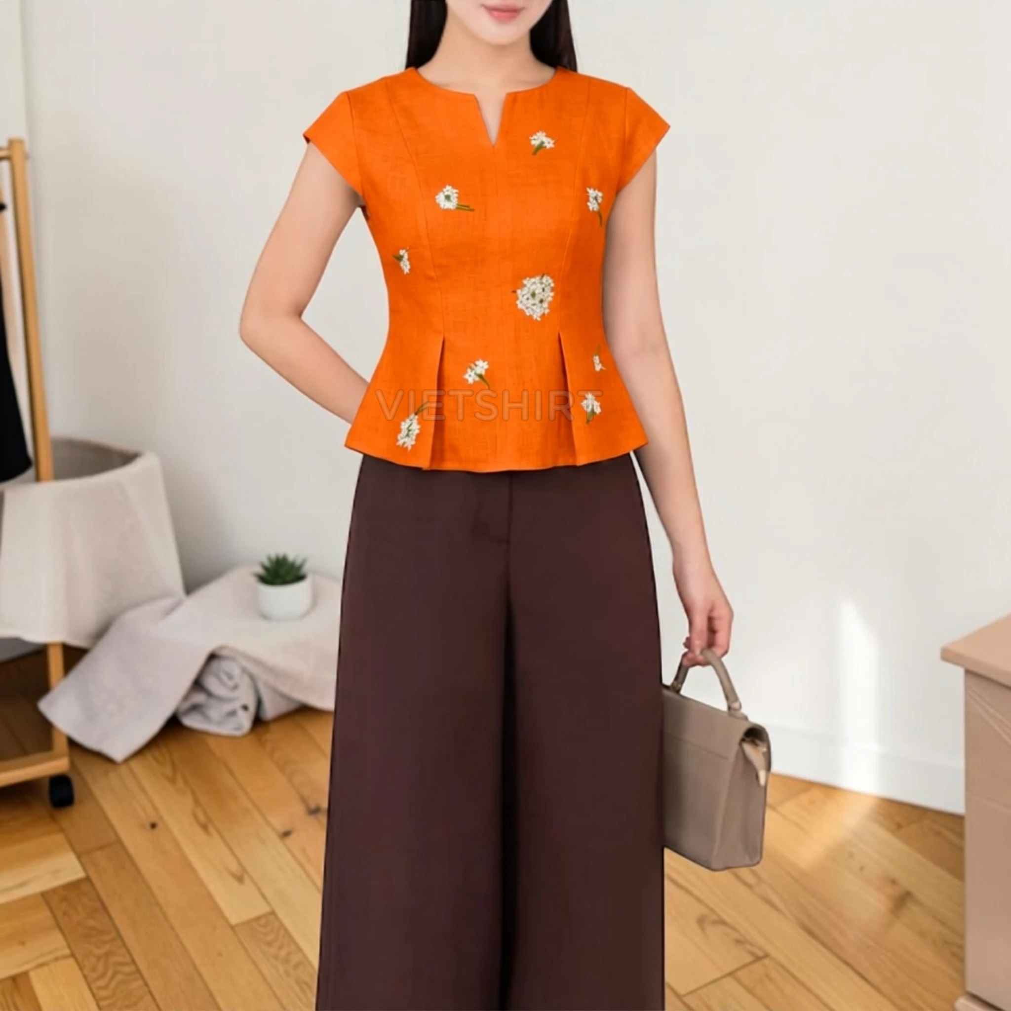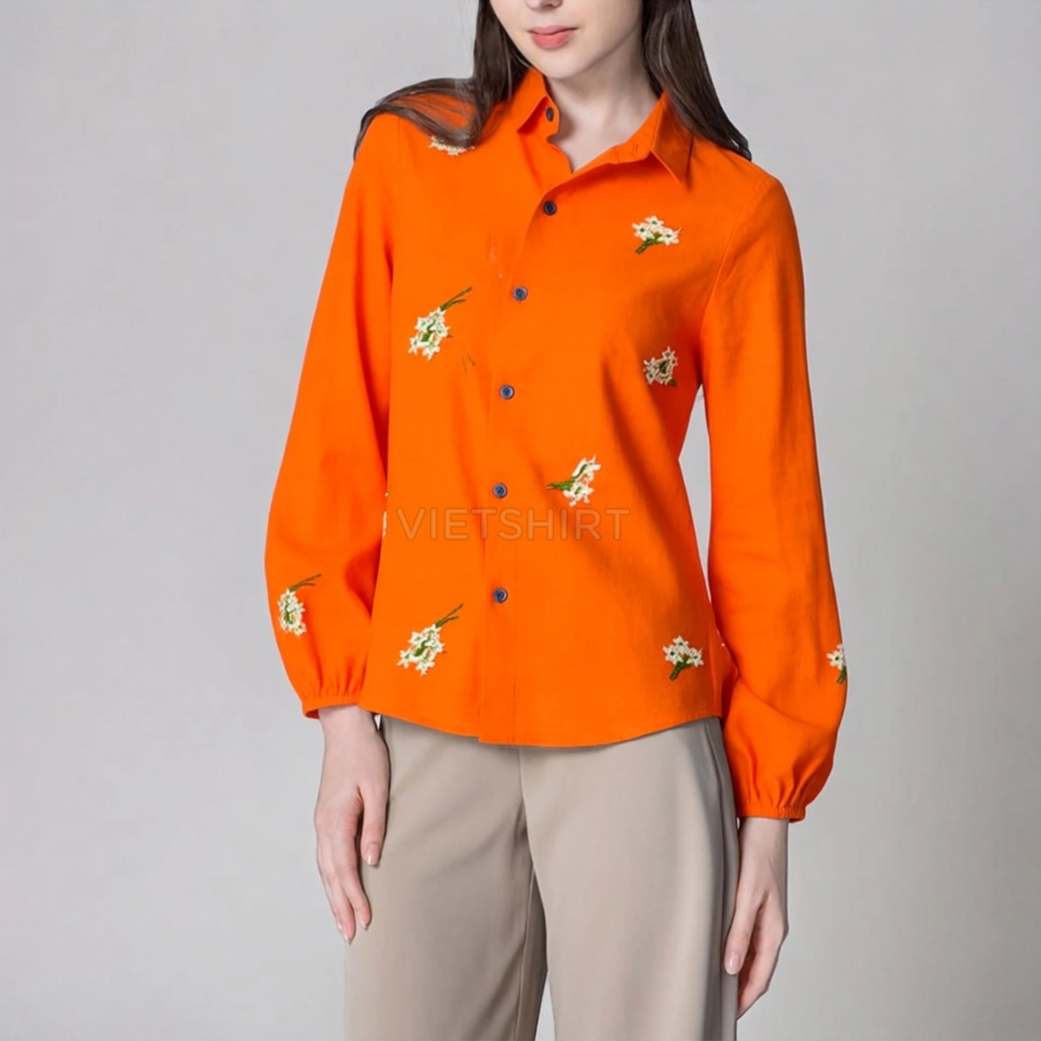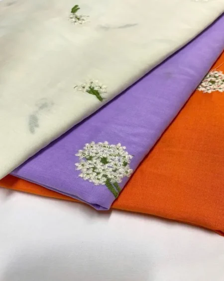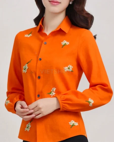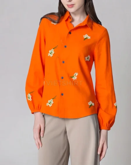 Vải may thô cotton thêu hoa màu cam